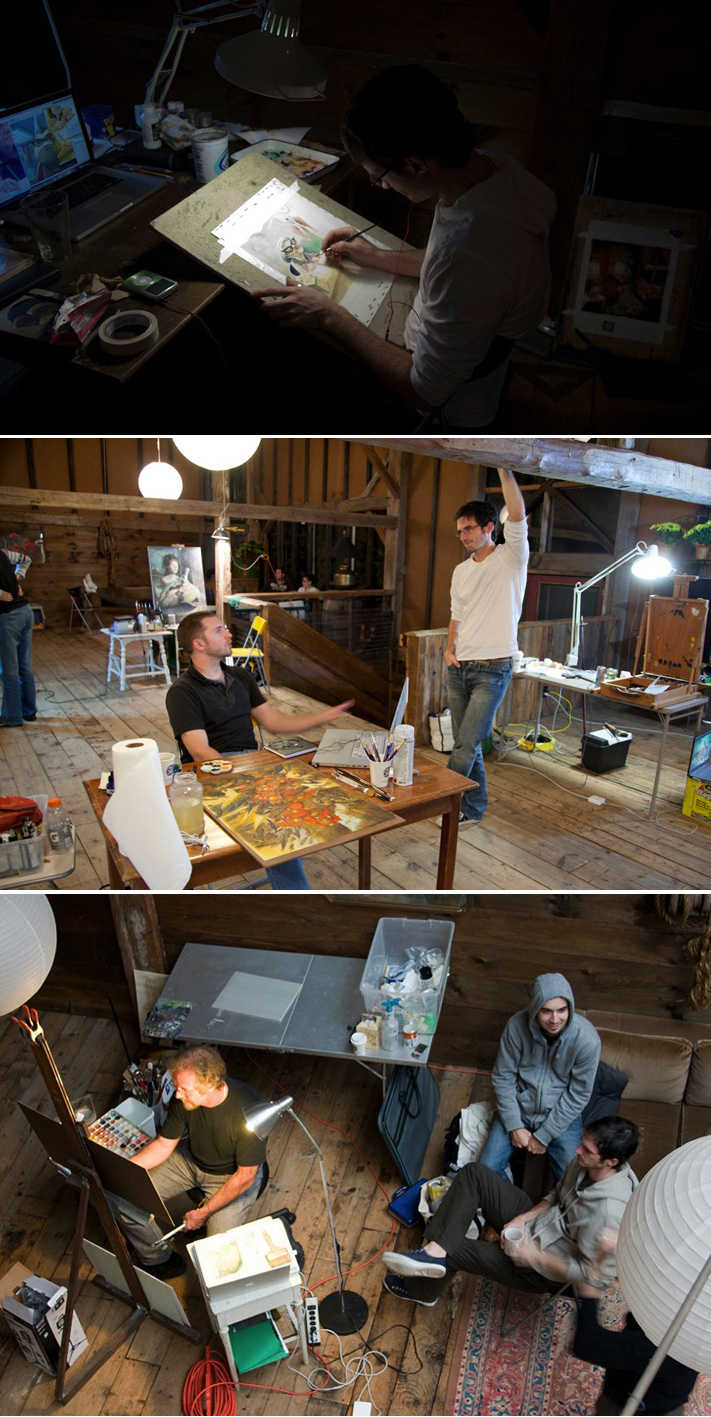 | Top: A rare shot of me actually working. Middle: Talking shop with Justin Gerard (although it looks more like he's telling me to settle down) Bottom: Dan Dos Santos and I watching Michael Whelan work his voodoo. |
